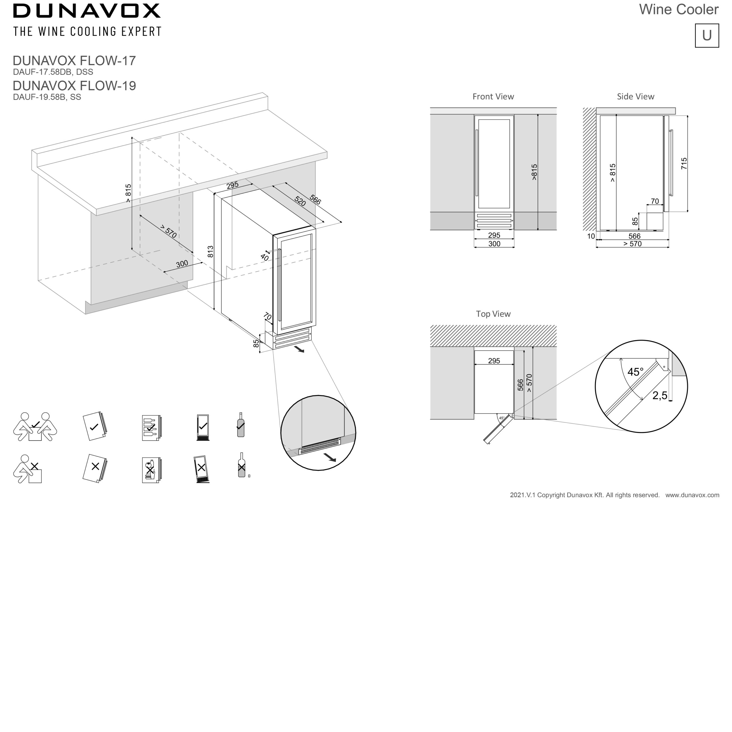 Frižider sa dve zone, ugradni model sa 17 boca, elegantne spoljašnjosti i ručkom od nerđajućeg čelika. DUNAVOX Flow -17 je savršen za savremena kuhinjska okruženja. Boce se nalaze na drvenim policama a uređaj poseduje unutrašnje plavo svetlo.