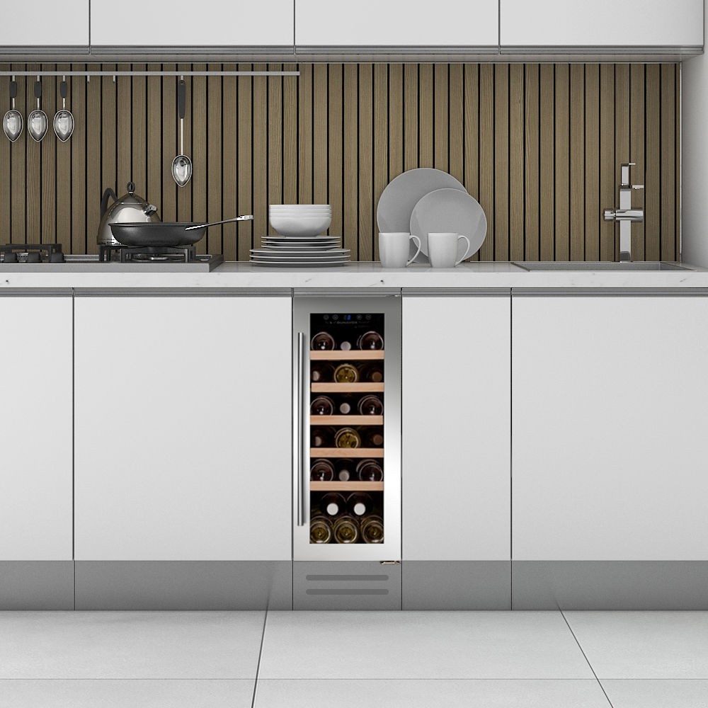 Ugradni model, sa jednom temperaturnom zonom, podpultni model kapaciteta 19 boca.Elegantan izgled i ručka od nerđajućeg čelika. DUNAVOX Flow-19 savršen je za savremene kuhinje. Boce se ređaju na drvene police i uređaj poseduje unutrašnje plavo LED osvetljenje.